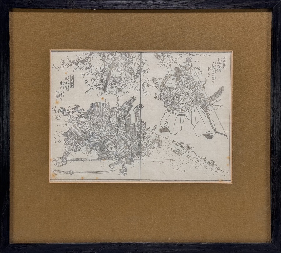 Japanse houtdrukken met strijderstafereel met boogschutter, samoerai worstelaars en demoon op een wolk, door Keisai Eisen (1790-1838) uit de serie "Pictures of Valiant Warriors". Eerste publicatie in 1838.