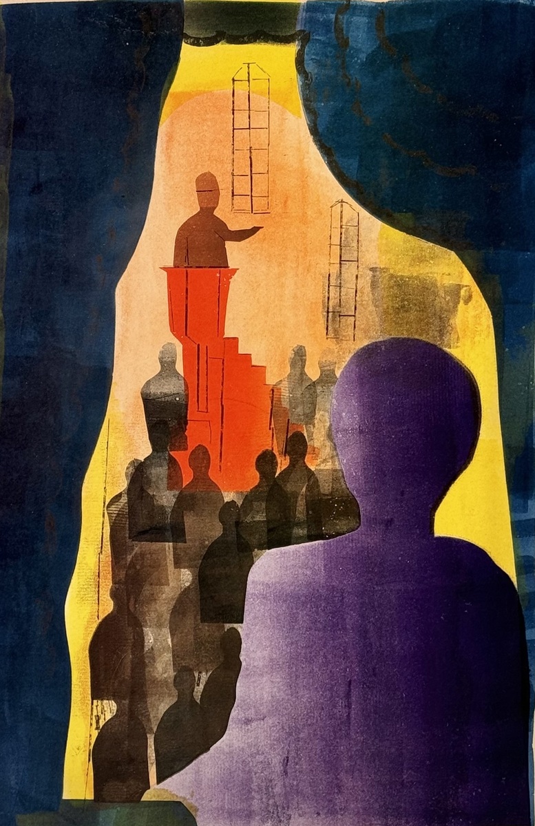Facsimile druk uit de Chassidische Legenden reeks getiteld “De bisschop en de Baalschem” van H.N. Werkman. Rechtsonder in de prent gesigneerd, uitgave van het Groninger Museum 1985.