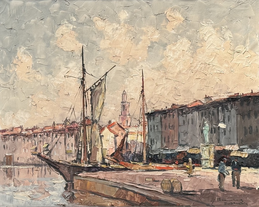 Schilderij getiteld “Dubrownik”, olieverfschilderij op linnen. Rechtsonder gesigneerd en getiteld, jaren 60/70.