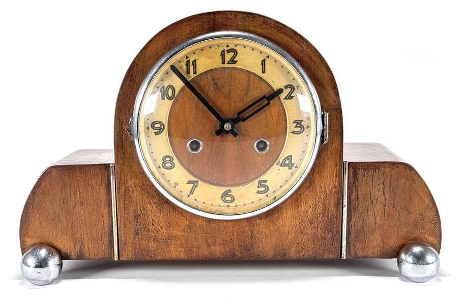 Art Deco houten pendule met verchroomde elementen en voorzien van een Minuta uurwerk, jaren 30.