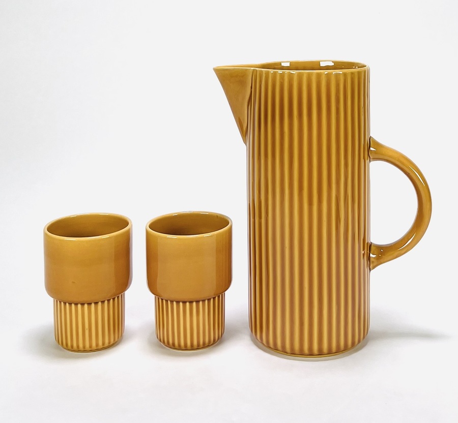 Keramieken okerkleurige schenkkan met twee drinkbekers door Potterie De Driehoek Huizen Holland. Aan de onderzijde gemerkt, jaren 60/70.