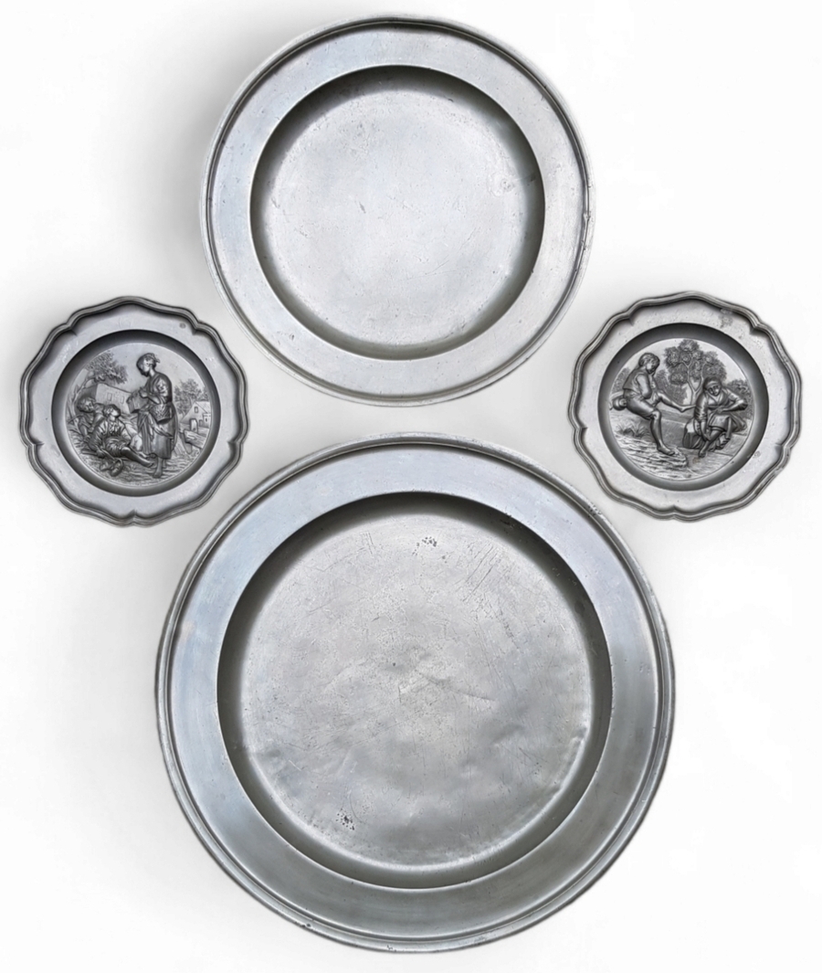 Twee grote klassieke tinnen borden en twee reliëf wandborden, 20e eeuw.