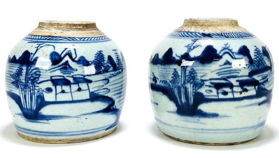 Twee Chinese handbeschilderde blauw-witte porseleinen gemberpotten met landschappelijke voorstelling, 19e eeuw.