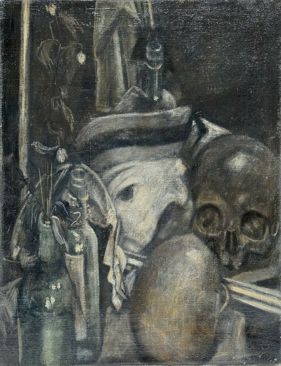 Schilderij “Vanitas” met schedel en flessen, olieverfschilderij op linnen. Anoniem, jaren 30/40.