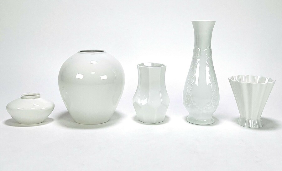Convoluut van vijf wit geglazuurde porseleinen vazen waaronder KPM (Königliche Porzellan-Manufaktur Berlin), Gerold, H &Co Selb, KPM München. Duitsland, jaren 60.