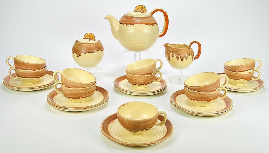 Art Deco keramieken theeservies door Schramberg Majolika bestaande uit een theepot, melk- en suikerstel en elf kop-en-schotels. Aan de onderzijde gesigneerd SMF Schramberg Majolika en modelnummer. Duitsland, jaren 30.