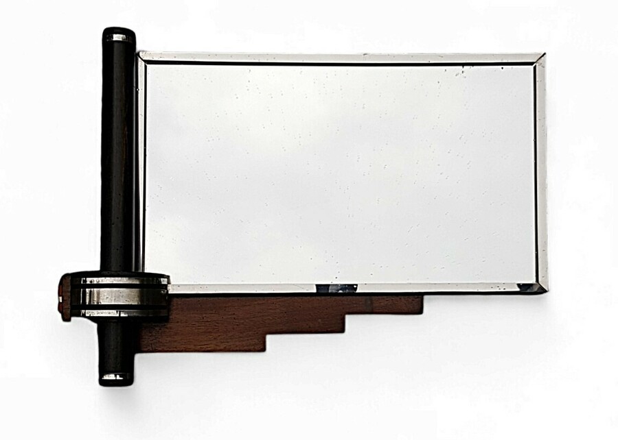 Art Deco spiegel, omstreeks 1930. Rechthoekig spiegelglas aan een bakelieten handgreep met verchroomd scharnier gemonteerd op een trapsgewijze houten plaat. Constructie met schroeven en ringen; draaibare greep.