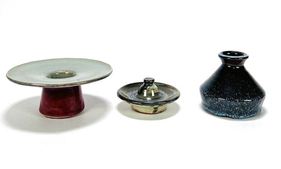 Keramieken kaarsenstandaard, vaas en object door pottenbakkerij Koch te Workum. Eind 20e eeuw.
