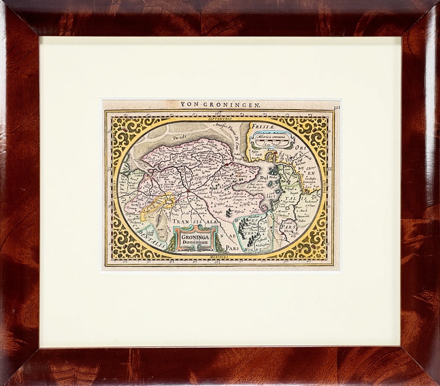 Handgekleurde kopergravure van de Provincie Groningen getiteld “Von Groningen” uitgegeven in het Nieuw Nederlandtsch Caerboeck door Abraham Goos te Amsterdam. Gepubliceerd tussen 1616-1625.