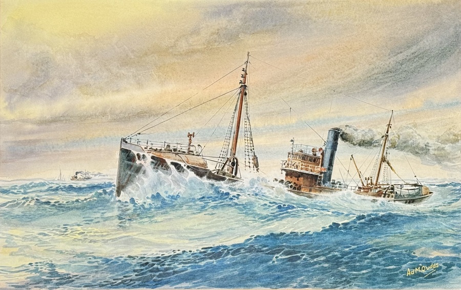 Aquarel van een zeegezicht met stoomsleepboot door Ad. M. Oudes. Rechtsonder gesigneerd, midden 20e eeuw.