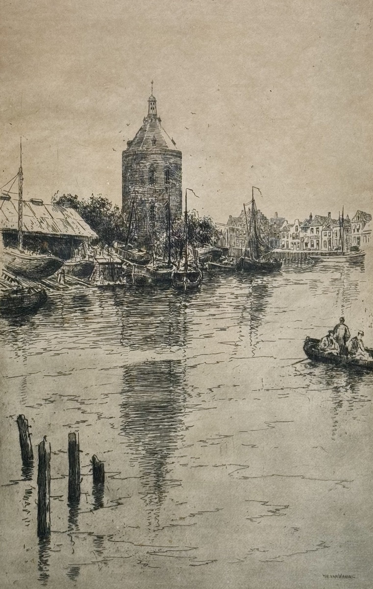 Ets van de haven van Enkhuizen met de Drommedaris door Martin van Waning (1889-1972). Rechtsonder in de ets met potlood gesigneerd, eerste helft 20e eeuw.