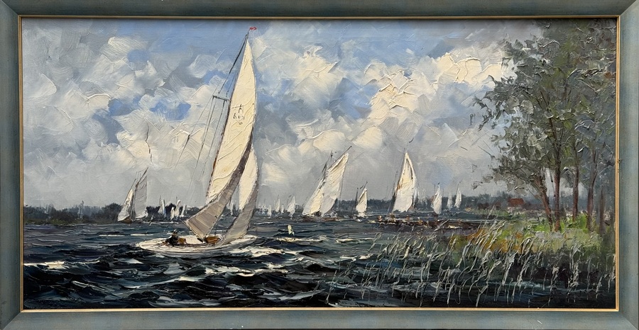 Schilderij van zeilboten op het meer door John Bevort (1917-1997). Olieverfschilderij op linnen, rechtsonder gesigneerd. Jaren 70.