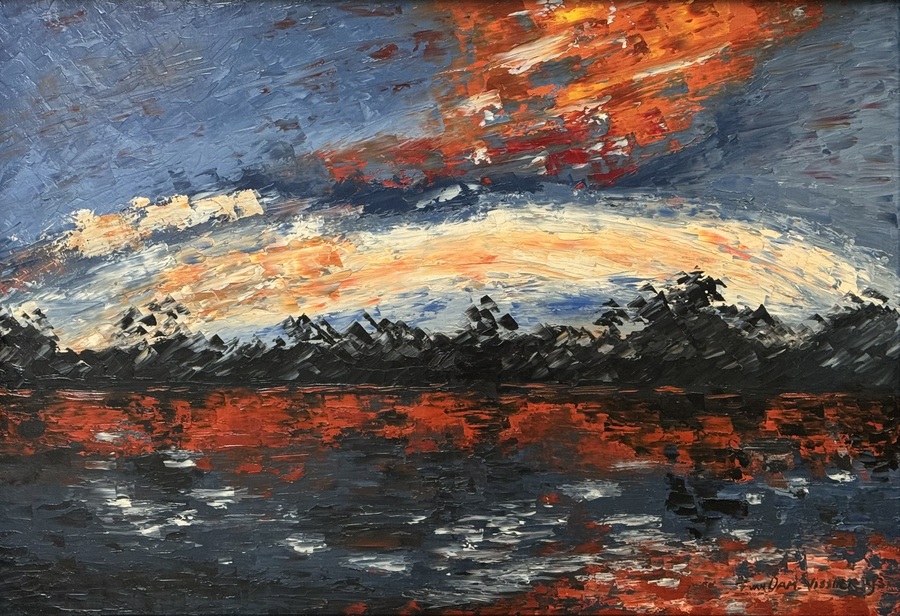 Schilderij met abstract landschap bij avondschemering door F. van Dam-Vissher, olieverfschilderij op linnen. Rechtsonder gesigneerd en gedateerd 1993.