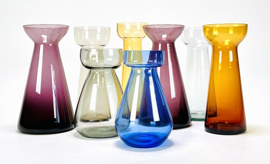Acht glazen hyacintvazen onder meer uitgevoerd door Glasfabriek Leerdam, jaren 60.
