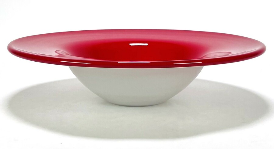 Glazen dubbellaags schaal in rode-melkglazen kleurslag. Eind 20e eeuw.