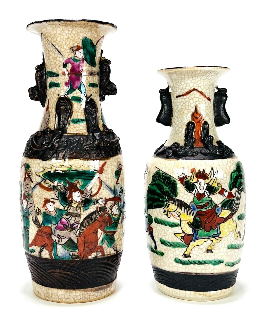 Twee keramieken polychroom beschilderde Nanking vazen gedecoreerd met krijgers. China, midden 20e eeuw.