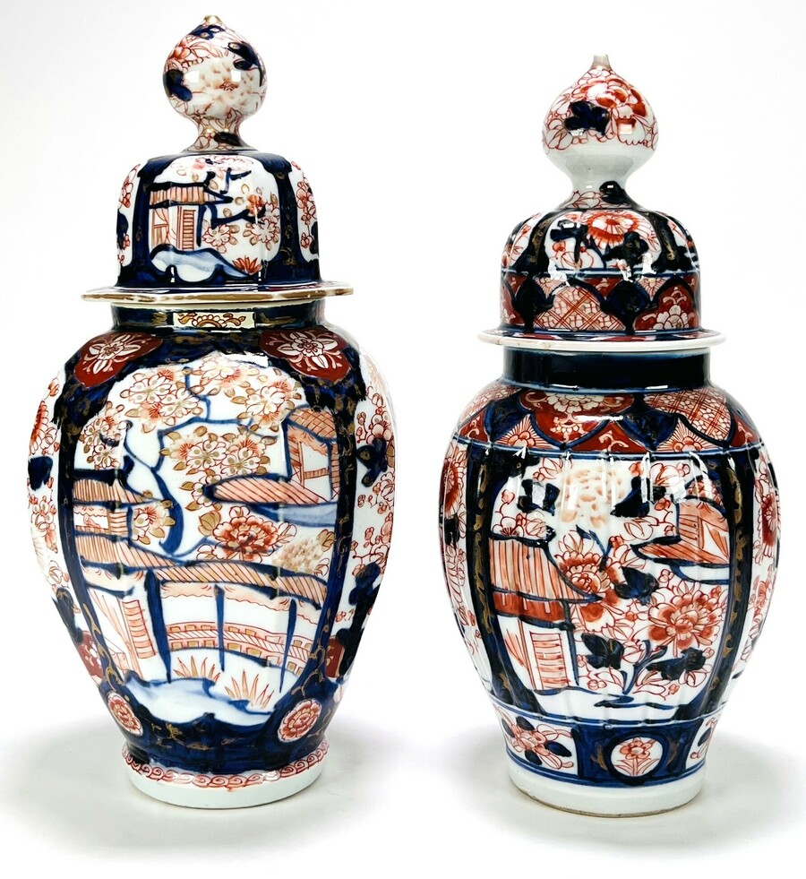 Twee handbeschilderde Japanse Imari porseleinen dekselvazen met handbeschilderd floraal decor. Begin 1900.
