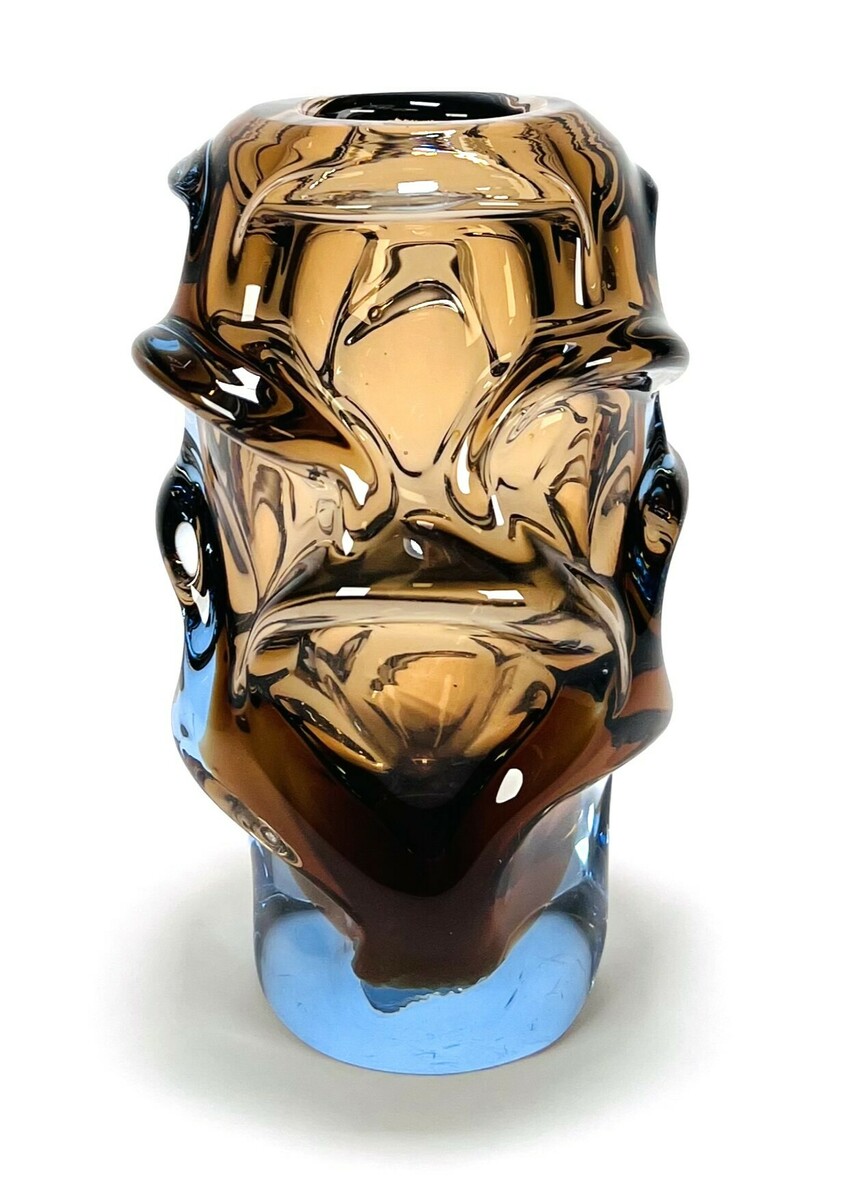 Kristallen vaas in blauw-bruine kleurslag naar ontwerp van Jan Beranek, modelnaam Atlas. Boheems vintage glas uit de jaren 60.