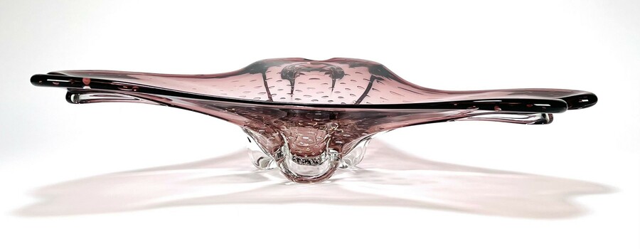 Vintage licht auberginekleurige Murano stijl glazen schaal met ingesloten luchtbellen. Jaren 60.