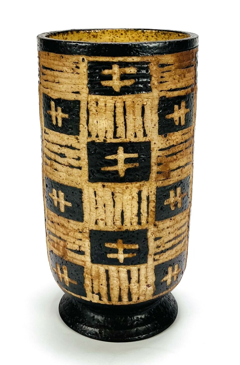 Aardewerken bruine vaas met ingekerfd decor door Jan van Stolk. Aan de onderzijde gemonogrammeerd, jaren 60/70.