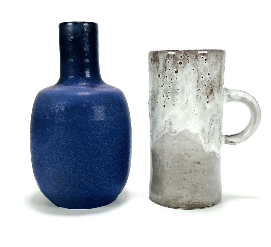 Twee keramieken objecten, een grijze pul door Meyer Groningen, onderzijde gesigneerd, jaren 20 en een blauw geglazuurde aardewerken vaas door Mobach Utrecht met modelnummer 504, jaren 60/70.