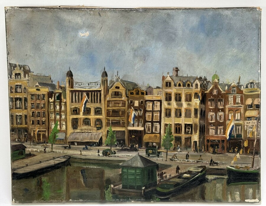 Schilderij het het Damrak te Amsterdam met de gebouwen op nummers 11 t/m 25, olieverfschilderij op linnen. Anoniem, jaren 30/40.