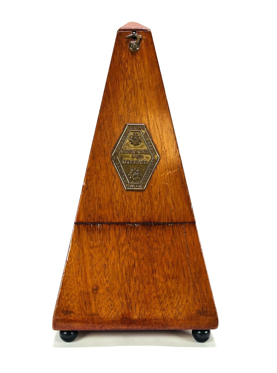 Metronoom in houten piramidevormige kast gemerkt Mètronome De Maelzel. Frankrijk, midden 20e eeuw.