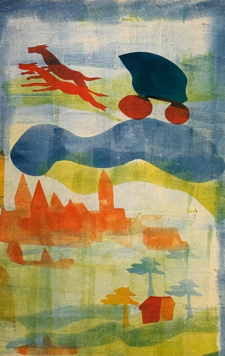 Facsimile druk uit de Chassidische Legenden reeks getiteld “De rit naar Berlijn” van H.N. Werkman. Rechtsonder in de prent gesigneerd, uitgave van het Groninger Museum 1985.