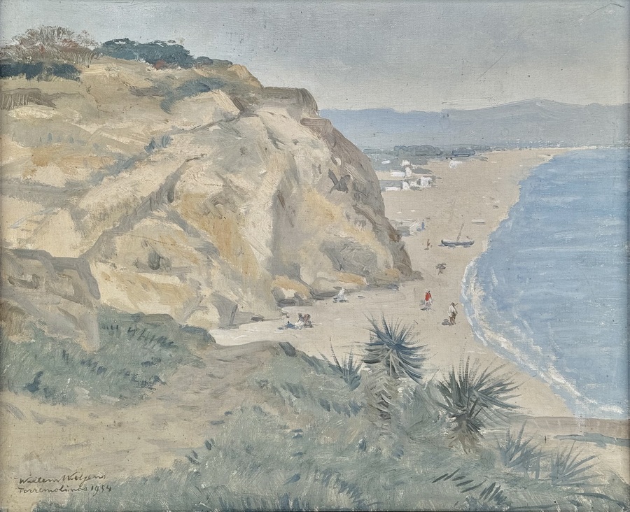 Schilderij getiteld “Langs het strand bij Torremolinos Malaga” door Willem Witjens (1884-1962). Olieverfschilderij op linnen, linksonder gesigneerd en gedateerd 1954. Verso informatie.