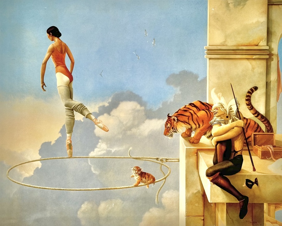 Kunstprent van een ballerina op koord van Michael Parkes. Eind 20e eeuw.