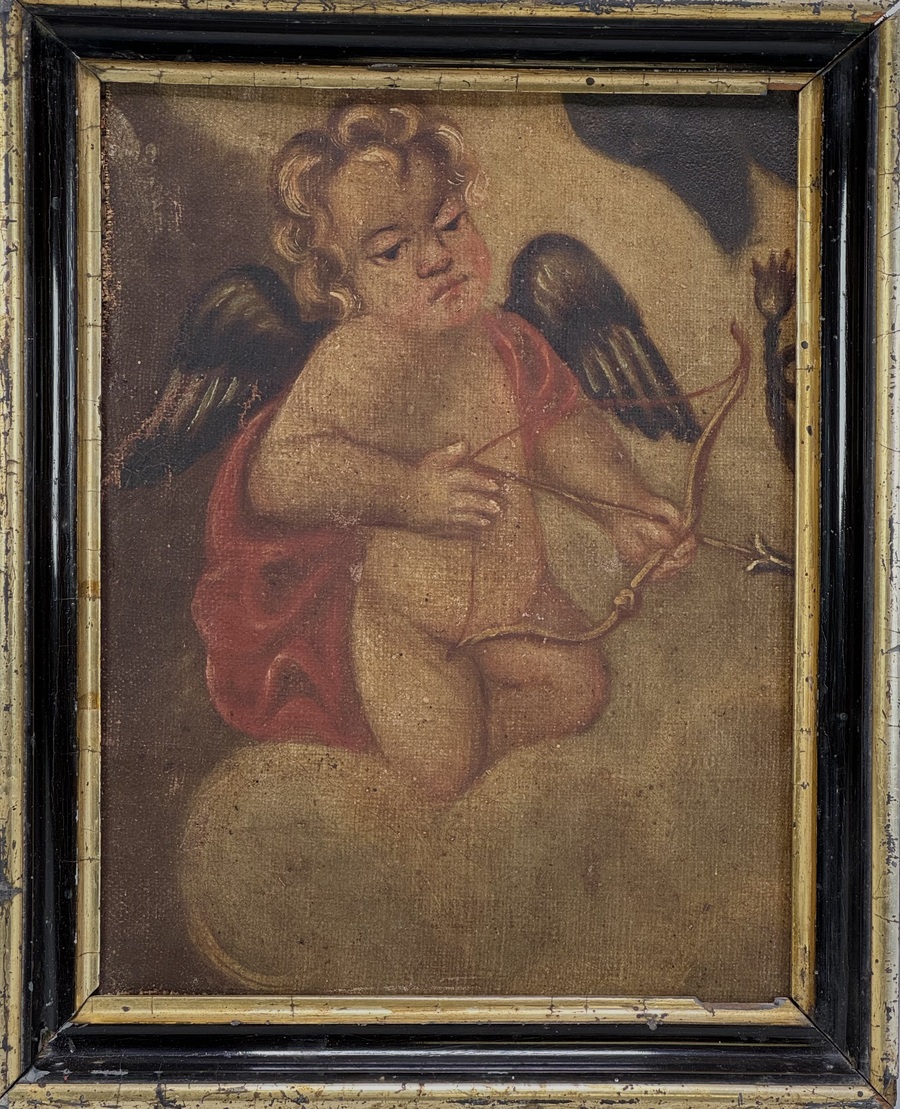 Schilderij van Amor met pijl en boog. Olieverf op linnen, marouflé op triplex. Anoniem, 19e eeuw.