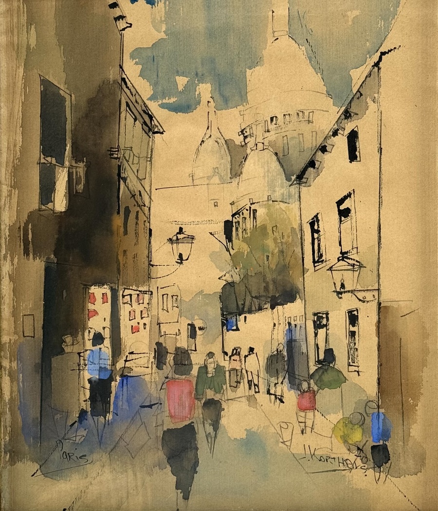 Tekening/aquarel van een straatscene bij de Basilique du Sacré-Cœur getiteld “Paris” door Johannes (Jan) Korthals (1916-1972). Gemengde techniek op papier, rechtsonder gesigneerd. Jaren 50/60.