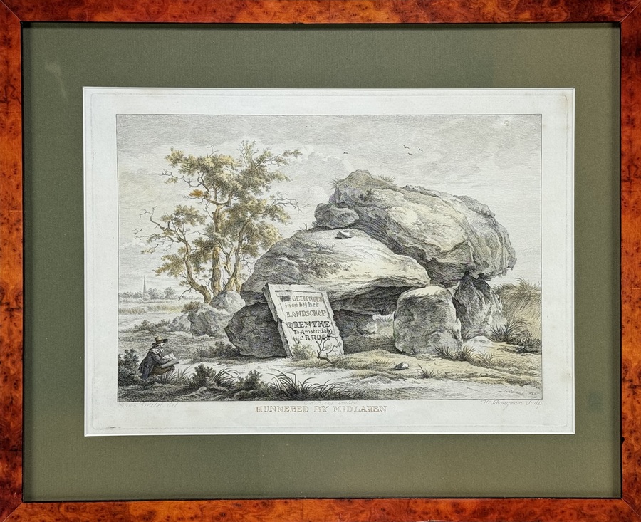 Kleurengravure getiteld “Hunnebed bij Midlaren”. Uitgevoerd door graveur H. Schwegeman, op basis van een werk van Egbert van Drielst (1745-1818). Uit de serie van negen gezichten in en bij het landschap Drenthe, gedrukt door Cornelis S. Roos te Amsterdam, 19e eeuw.