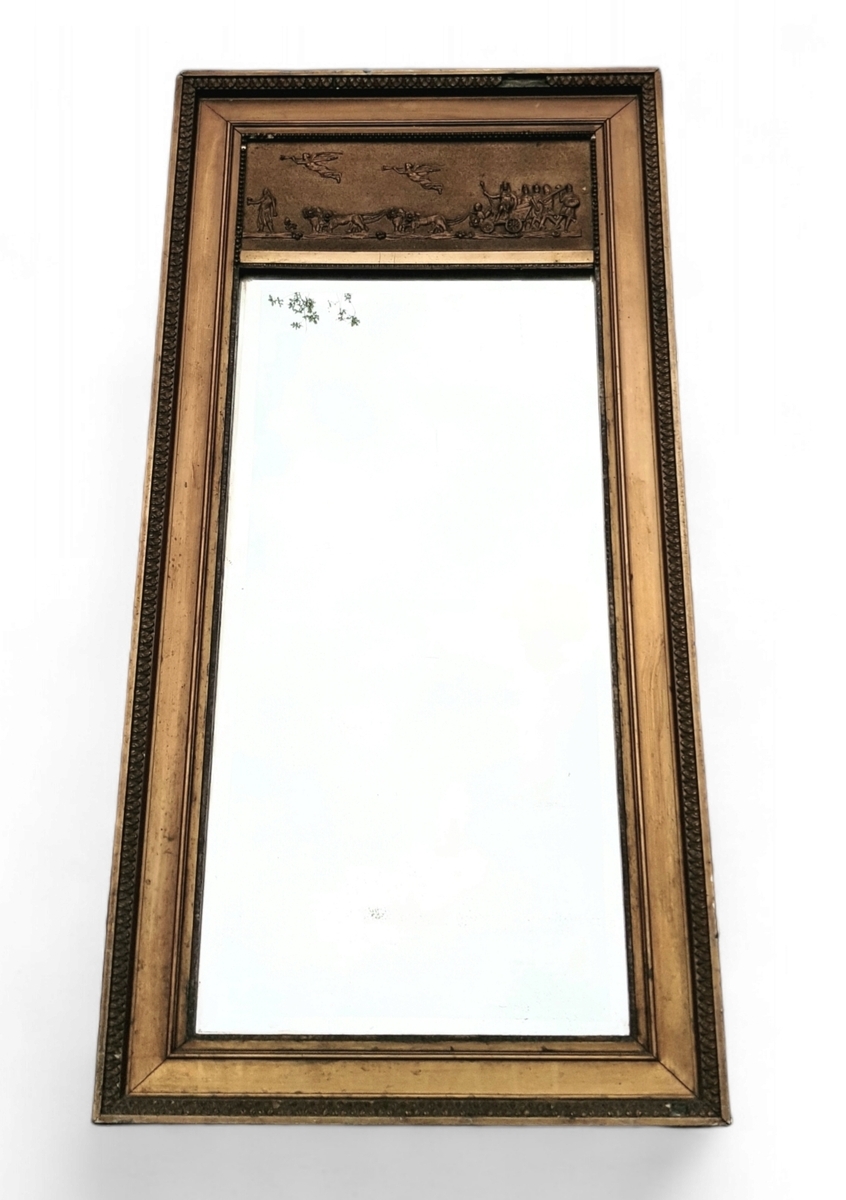 Klassieke houten spiegel met gipsopbouw met decor van bazuin spelende engelen en strijdkar voortgetrokken door leeuwen. Omstreeks 1900.
