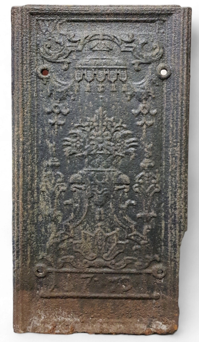 Gietijzeren haardplaat gedecoreerd met tuinvaas en bloemen, gedateerd 1779.