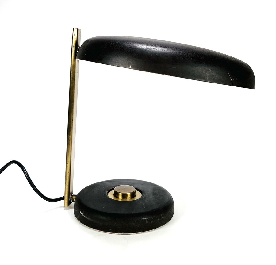 Donkergrijs met een vleugje bruin bureaulamp met messing elementen door lampenfabrikant Hillebrand, modelnummer 7004 211 naar ontwerp van Heinz F.W. Stahl. Ontwerp stamt uit de jaren 70 en gefabriceerd in West-Duitsland.