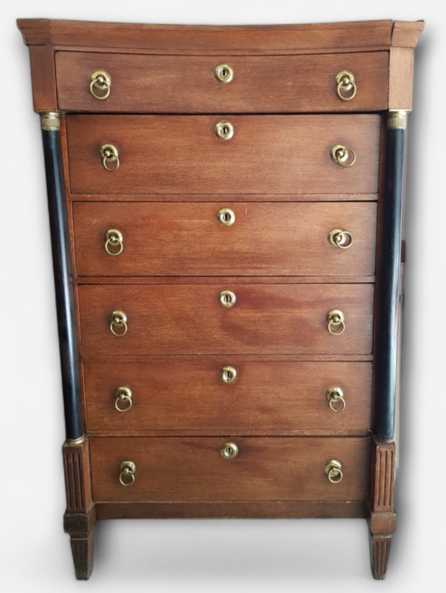 Eikenhouten Empire chiffonnière met zes lades voorzien van messing ringbeslag, met aan weerszijden geëboniseerde pilaren. Eerste helft 19e eeuw.