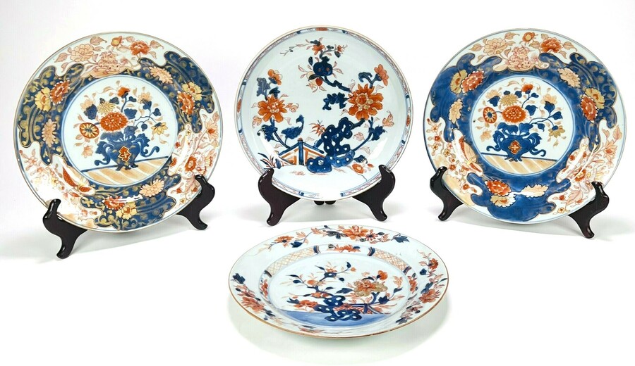Vier porseleinen handbeschilderde Imari borden met floraal decor. China, begin 18e eeuw