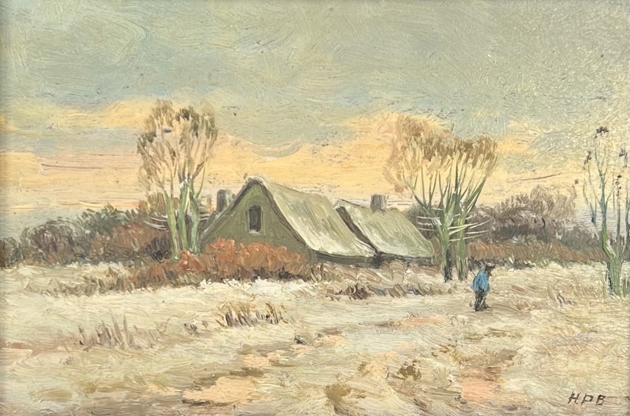 Schilderij van een winters landschap met boerderij en voortschrijdende man. Olieverfschilderij op paneel, rechtsonder gemonogrammeerd H.P.B., tweede kwart 20e eeuw.