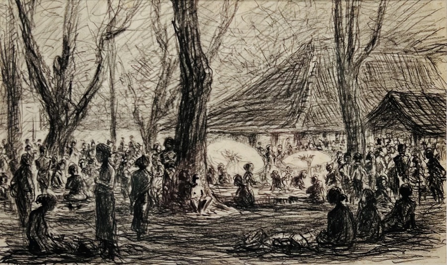Potloodtekening getiteld “Pasar Magelang, Java” door Gijsbert Brand Hooyer (1848-1934). Potlood op papier, linksonder gemonogrammeerd GBH. Indonesië, begin 1900.