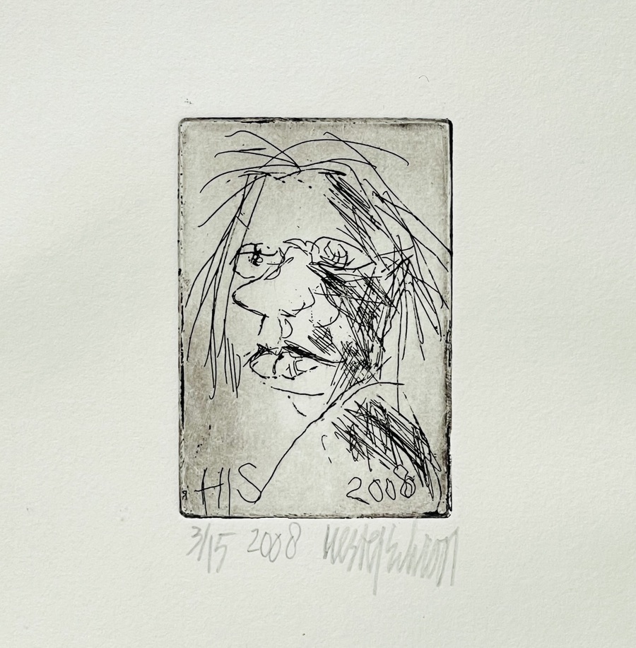 Ets getiteld “Hoofd” door Hester Schroor (1960). Ets op handgeschept papier, gemonogrammeerd en gedateerd in de etsplaat, rechtsonder met potlood gesigneerd en vermelding van oplagenummer 3/15 uit 2008.