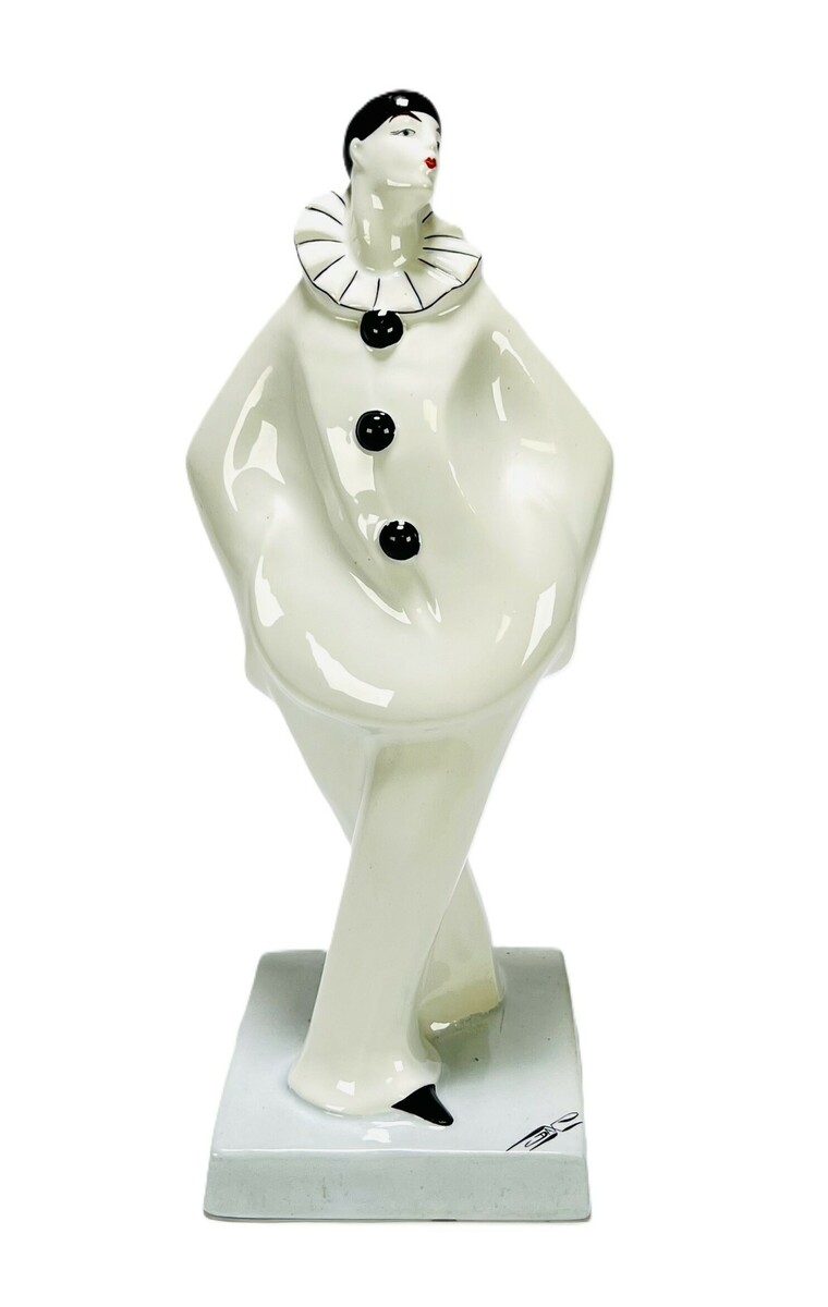 Porseleinen Art Deco beeld van een pierrot naar ontwerp van Edward Cazaux (1889-1974), pseudoniem Dax, uitgevoerd door Moulin des Loupes & Hamage. Gesigneerd aan de bovenzijde Dax. Frankrijk, omstreeks 1925-1930.