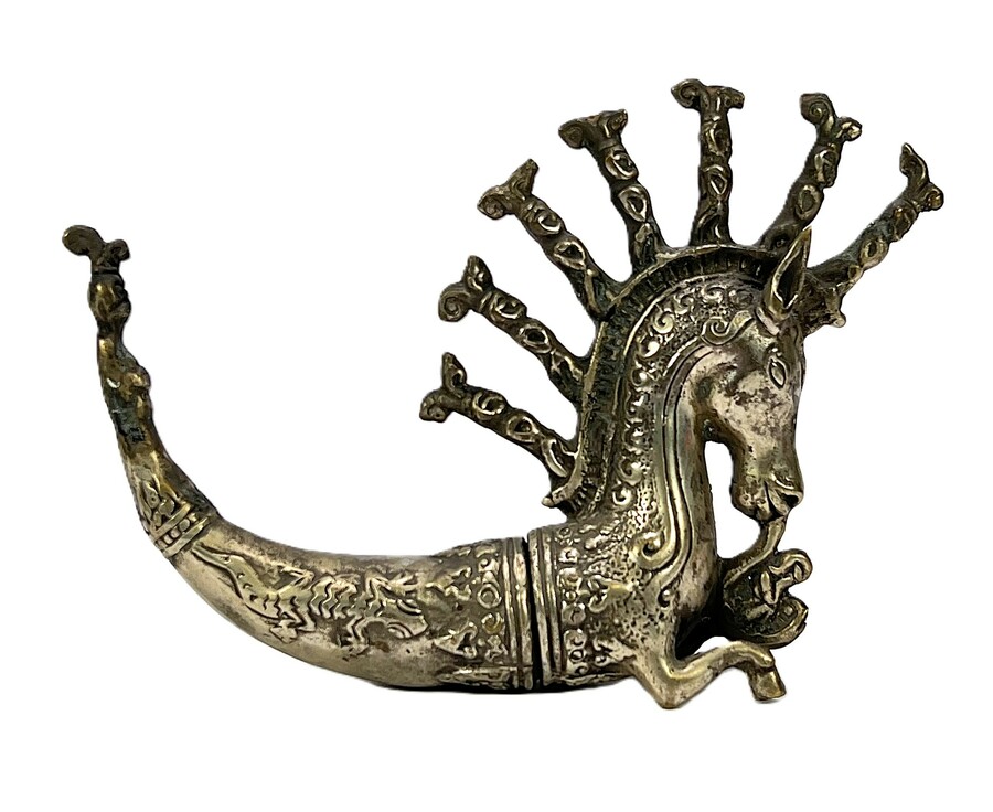 Batak metalen medicijnhouder, Naga Morsarang in paard vorm. Sumatra. Indonesië, eind 20e eeuw.