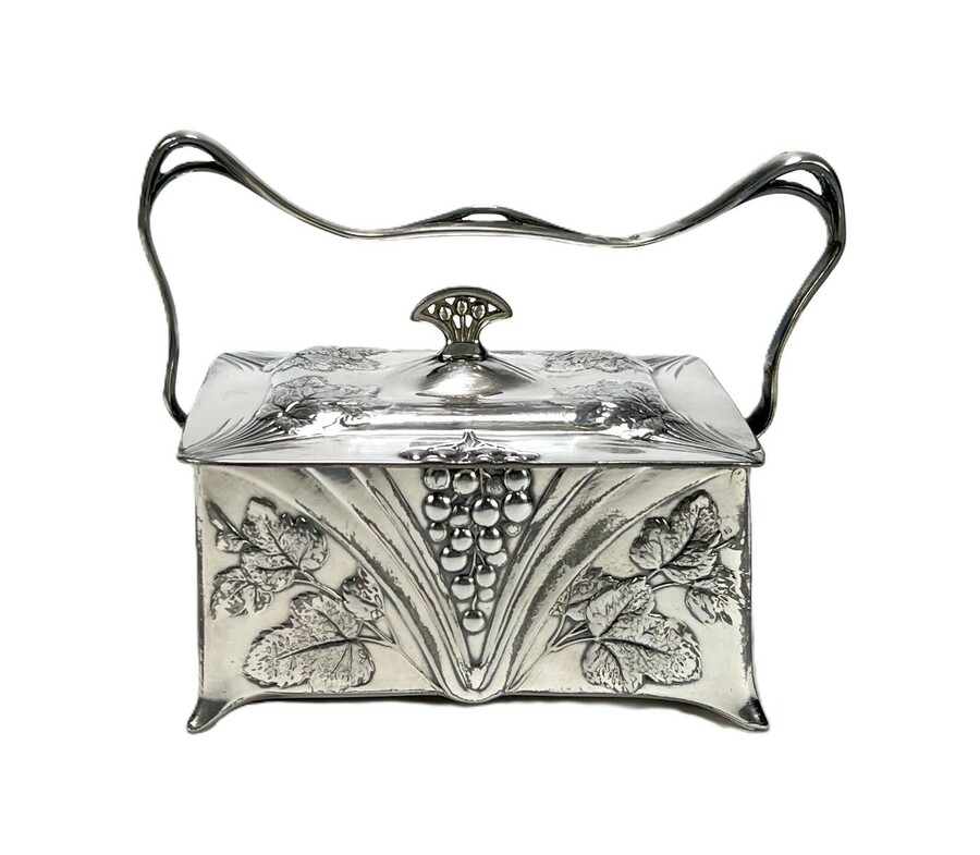Verzilverde Art Nouveau dekseldoos met handvat gedecoreerd met wijnranken door Christofle Paris. Aan de onderzijde gemerkt Orfevrerie Gallia en genummerd 4621. Frankrijk, omstreeks 1910.