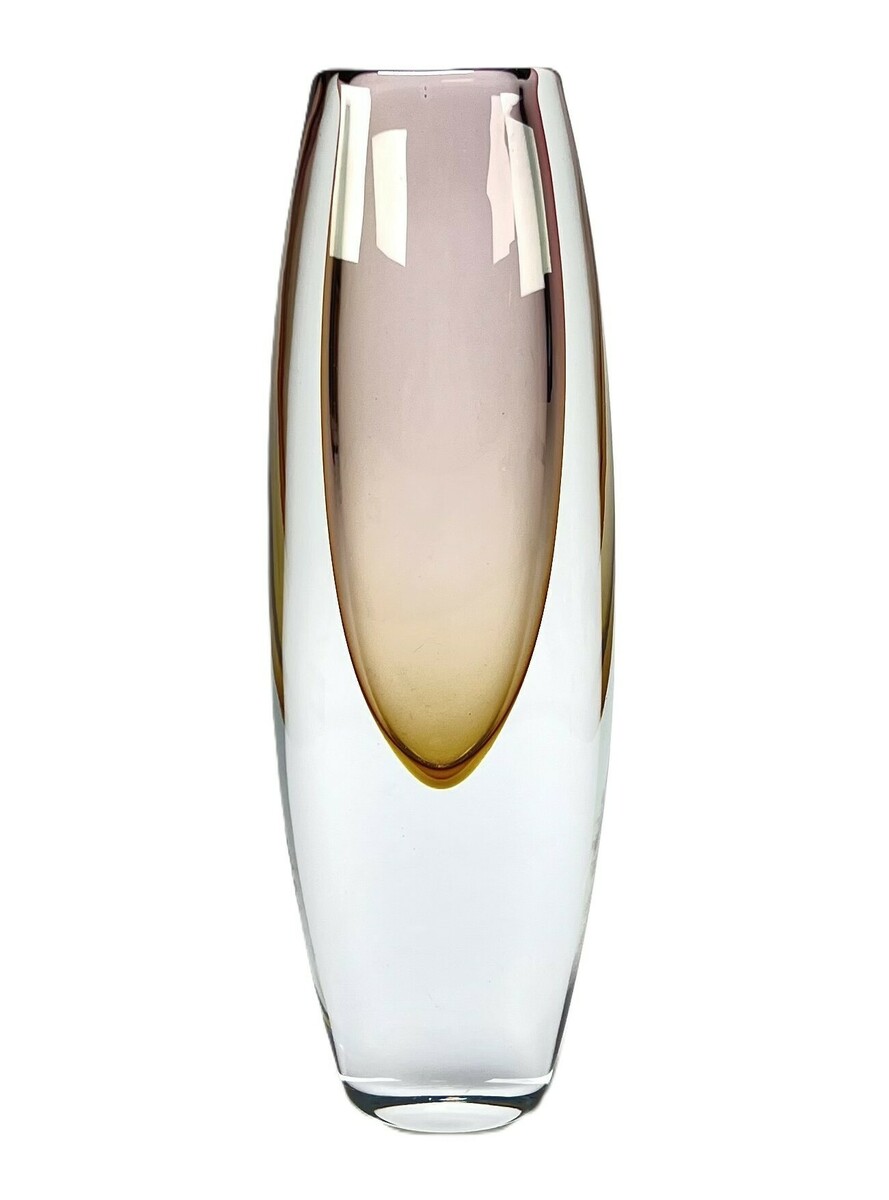 Kristallen vaas in Sommerso techniek met een amber en auberginekleurig kleurelement, gefabriceerd door Glasfabriek Strömbergshyttan, Zweden, jaren 50.