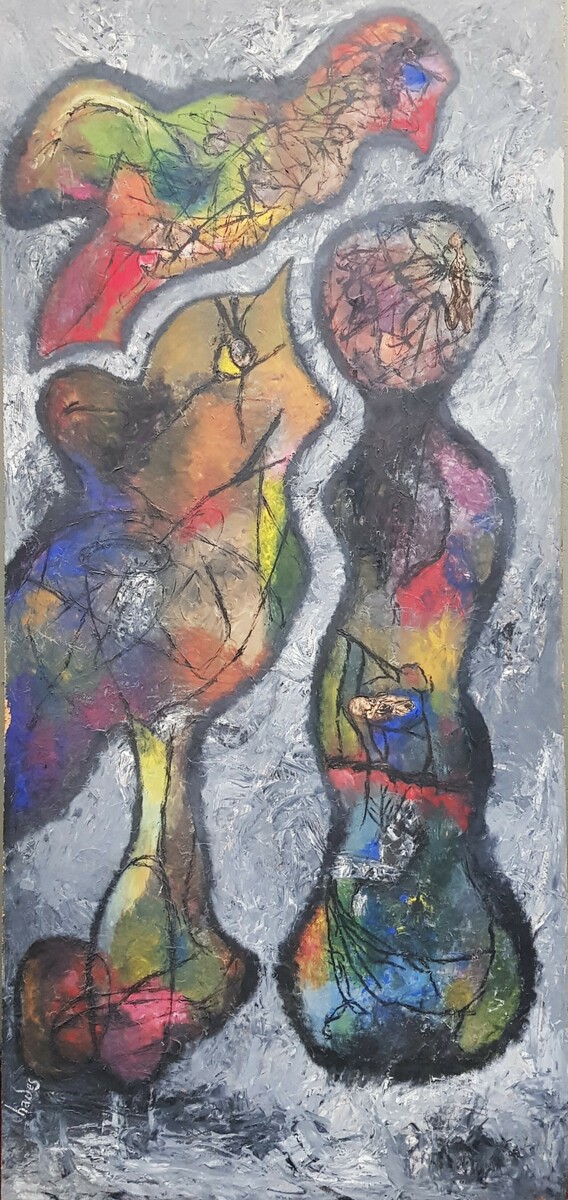 Schilderij met een abstracte compositie getiteld “De bevruchting” door Hades. Olieverfschilderij op spaanplaat, linksonder gesigneerd, verso twee gedichten, jaren 60. Betreft een schilderij op groot formaat.