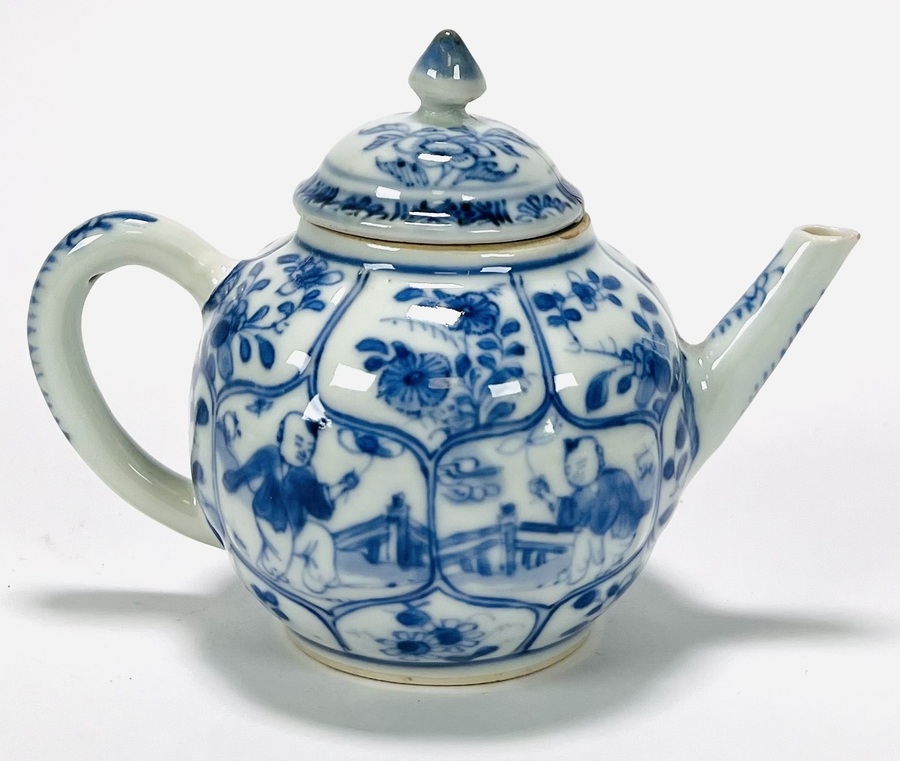 Chinees porseleinen trekpotje, Kangxi , omstreeks 1700, uitgevoerd in blauw-wit beschildering. Bolvormig model met rechte tuit, gebogen oor en deksel met spits toelopende knop. Decoratie in cartouches met florale motieven en spelende kinderen in landschap, uitgevoerd met kobaltblauw onder transparant glazuur. Paneelindeling rondom en fijn uitgewerkte details, binnenzijde geglazuurd.