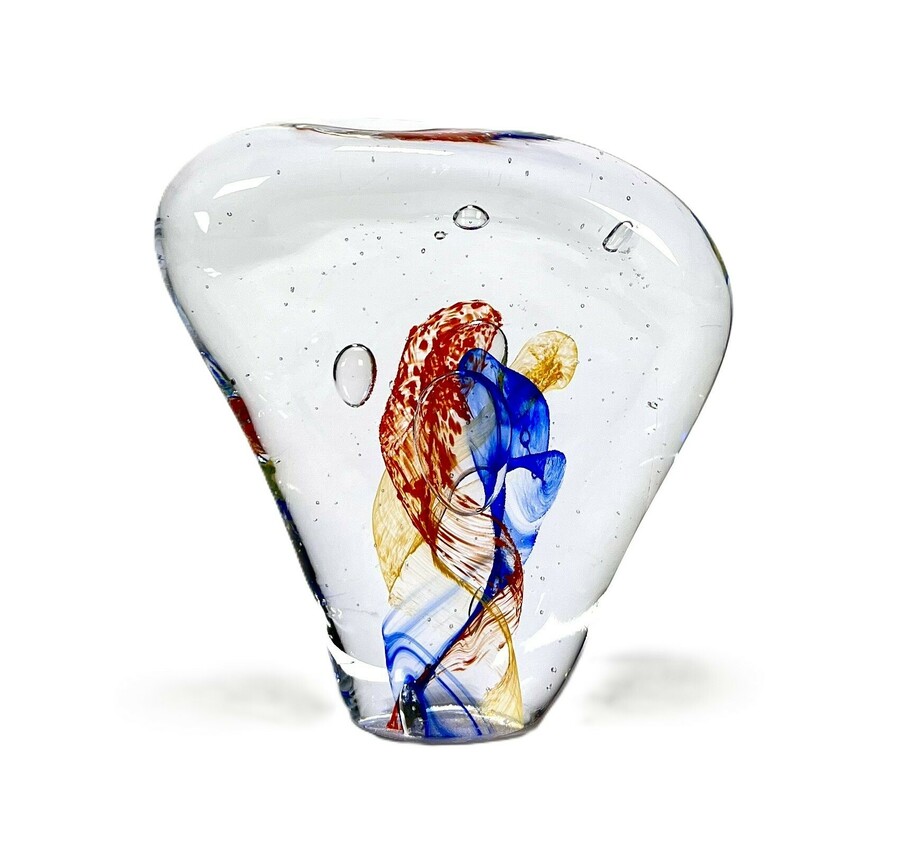 Ambachtelijk gevormde glasobject met inwendige kleurenspel in primaire tonen door Cees van Olst (1947-2014). Gesigneerd aan de zijkant, vierde kwart 20e eeuw.