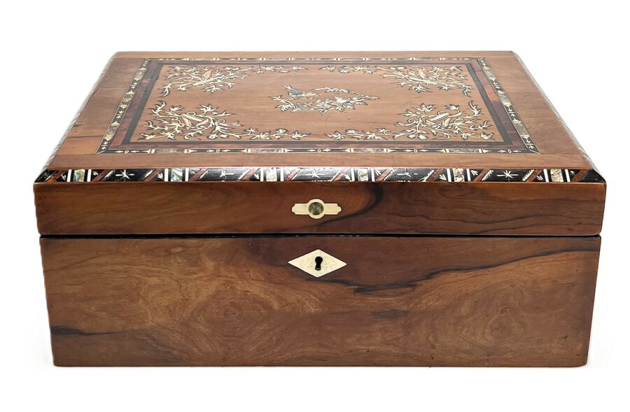 Mahoniehouten schrijfkist met marqueterie van onder meer parelmoer en tropische houtsoorten. Tweede helft 19e eeuw.