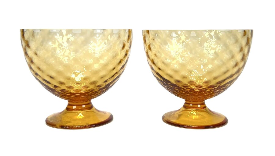 Twee amberkleurige Murano mondgeblazen coupes van Gino Cenedese. Venetië, omstreeks 1985.